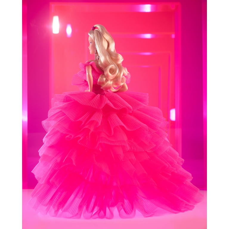 Introducing the Barbie Pink Collection, where classic Barbie glamor meets on-trend fashions. Featuring a Silkstone body, the first doll in the collection is stunning in an off-the-shoulder high-low gown with bow accents and a dramatic train of cascading tulle. Bow-kissed sandals and elegant drop earrings complement her striking silhouette. In premium packaging ideal for display, this bold celebration of Barbie doll’s iconic signature color makes the perfect gift for collectors. Includes a doll stand and Certificate of Authenticity. Doll cannot stand alone. Colors and decorations may vary.