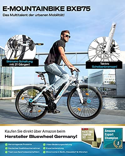 BLUEWHEEL E-Bike 27,5“ & 29“ I Deutsche Qualitätsmarke | EU-konform E-Mountainbike 21 Gänge & Hinterradmotor für 25 km/h | Fahrrad mit MTB Federgabel, App, LED Licht & Sportsattel | BXB75 Ebike photo review