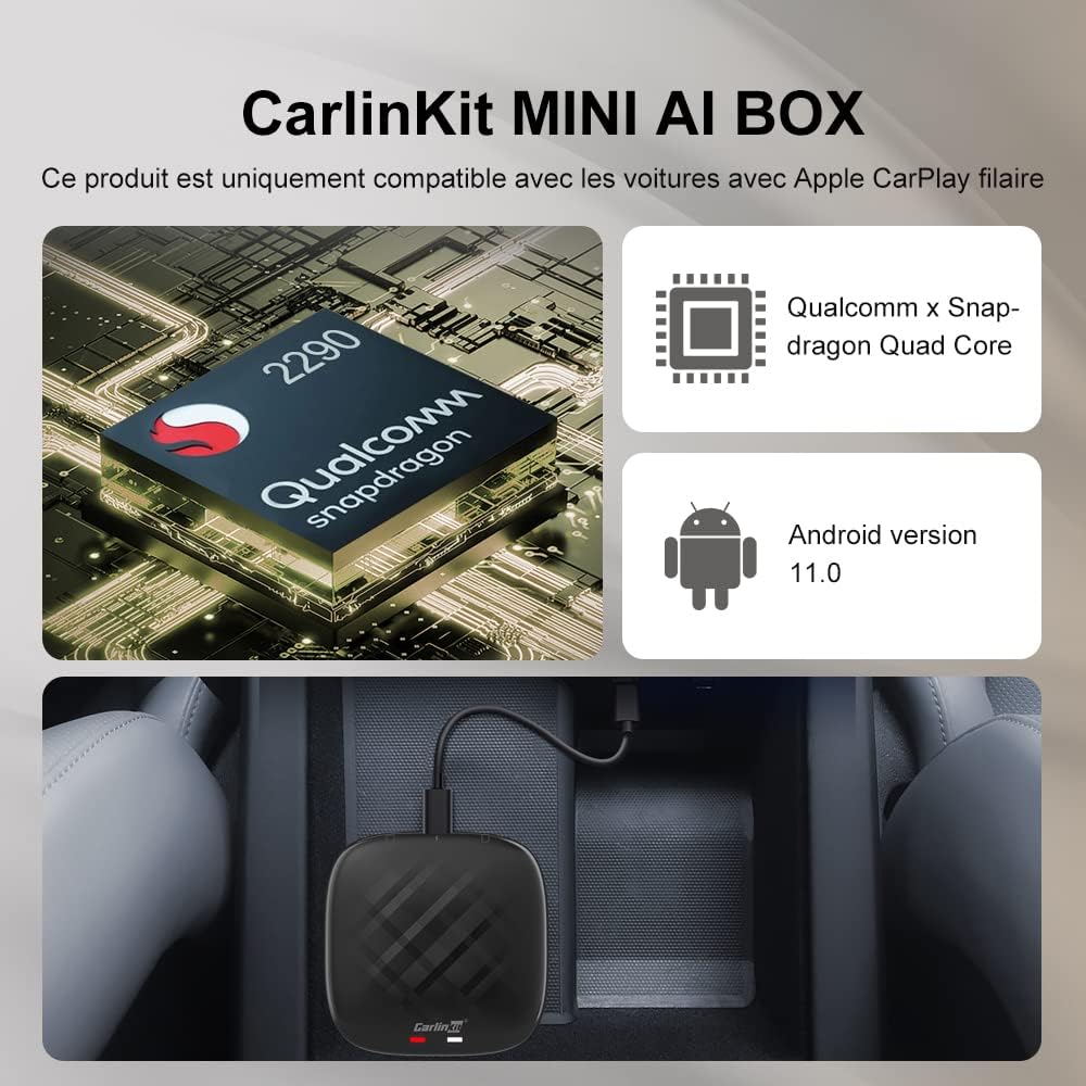 CarlinKit Mini AI Box Carplay sans Fil/Android Auto, Version Android 11.0, mémoire 3 + 32G, pour Les Voitures avec Apple CarPlay câblé en Usine, Prend en Charge Youtube, Netflix, Double Bluetooth