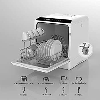 - LARGE CAPACITY: This tabletop dishwashers only measures 16.9 x 16.8 x 18.1 inches, but can hold up to 4 full place settings and fit up to 12″ dishes loaded at an angle; the storage rack and cutlery basket make it easy to clean ”top rack only” items such as knives, forks, and spoons, leaving more space for dishes and small pots; To Ensure Optimum Dishwasher Performance, Please Only Use Dishwasher Detergent