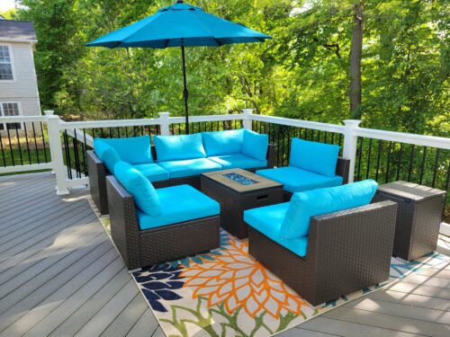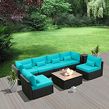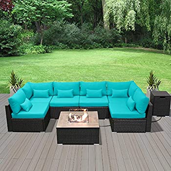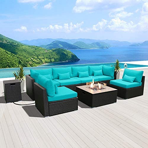 DINELI Patio Furniture Sectional Sofa with Gas Fire Pit Table Outdoor Patio Furniture Sets Propane Fire Pit (Turquoise-Square Table)