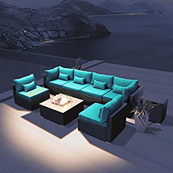 β Wicker Patio Furniture with Fire Pit β8pc Set consists of 2 Corner sofa + 4 Middle Sofas + 1 Fire Pit Table with glass wind guard fence, lava rocks and cover + 1 Tank hideaway table . (Throw Pillows Not Included)