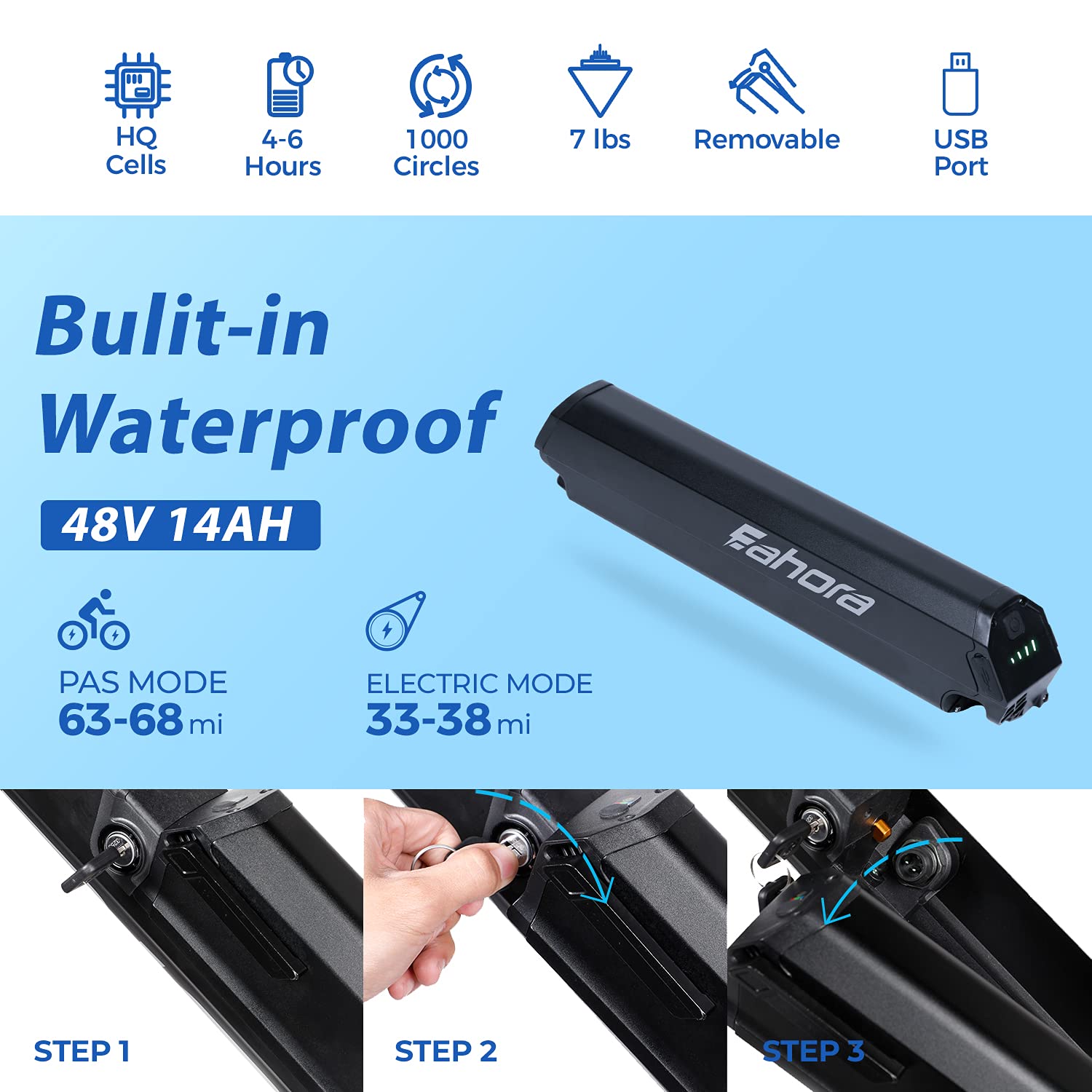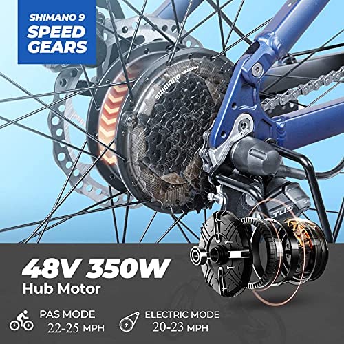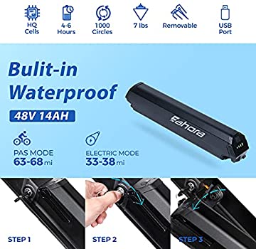 • γ€πŸ‘‰FASTER & FARTHERΒ πŸ‘ˆγ€‘ AM100 Plus electric bike is styled in 6061 Aluminum alloy frame, Air front suspension Fork, adjustable preload to match weight and riding style for a great riding experience. 350W Power Brushless Motor Can Reach 26MPH. 48V 14Ah Large Capacity Samsung Lithium Battery. Electric Mode Mileage: 33-40 miles, E-PAS Mode: 70-80 miles, Sport Mode: 60-90 miles. Ebike Weight: 60 LBS. Load Capacity: 240LBS.