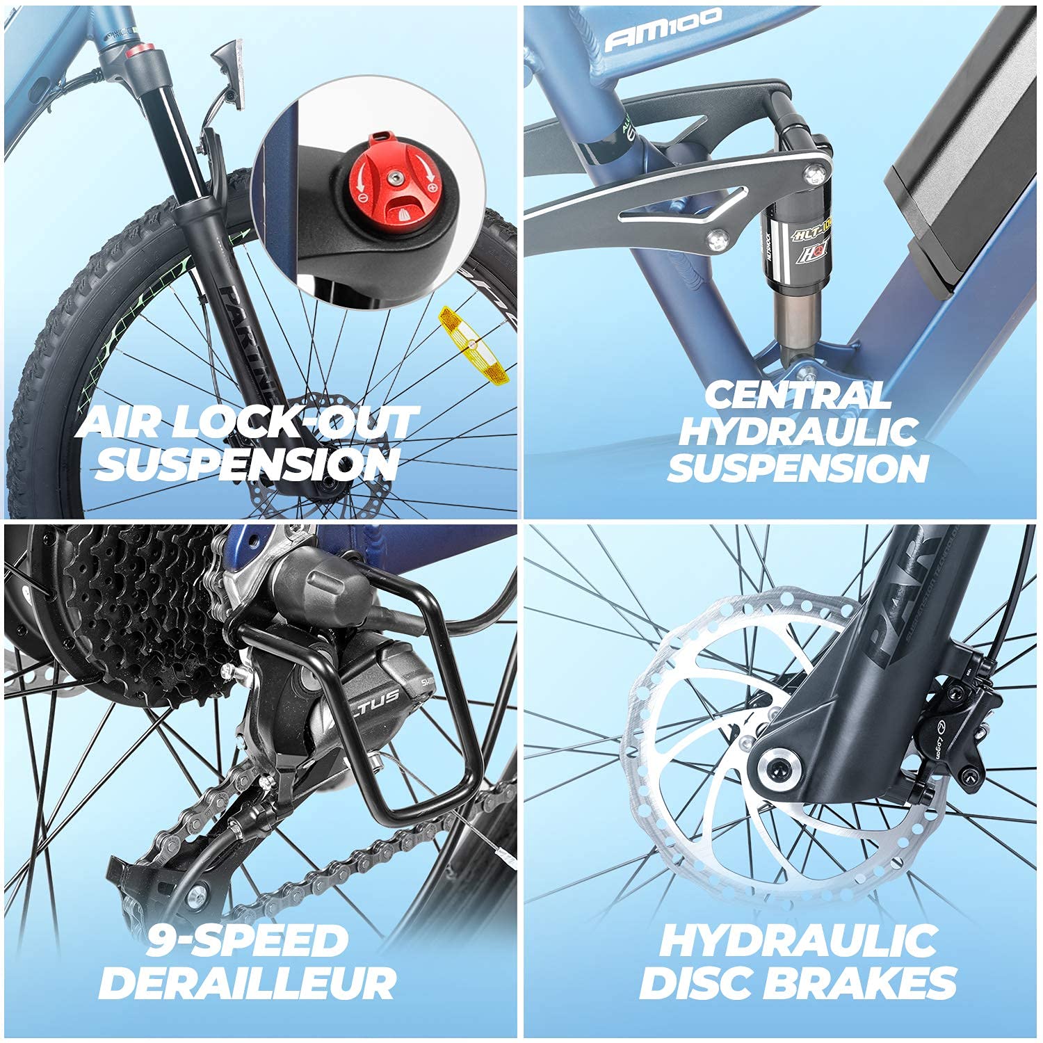 • The AM100 is not only an excellent professional mountain bike, it is also equipped with a powerful motor, Shimano 9-speed shifter system, full-aluminum PROWHEEL crank set and positioning chain, making the overall transmission system smooth and durable. Lockable and adjustable suspension front forks convert all the power into forward power during climbing or riding on level roads.