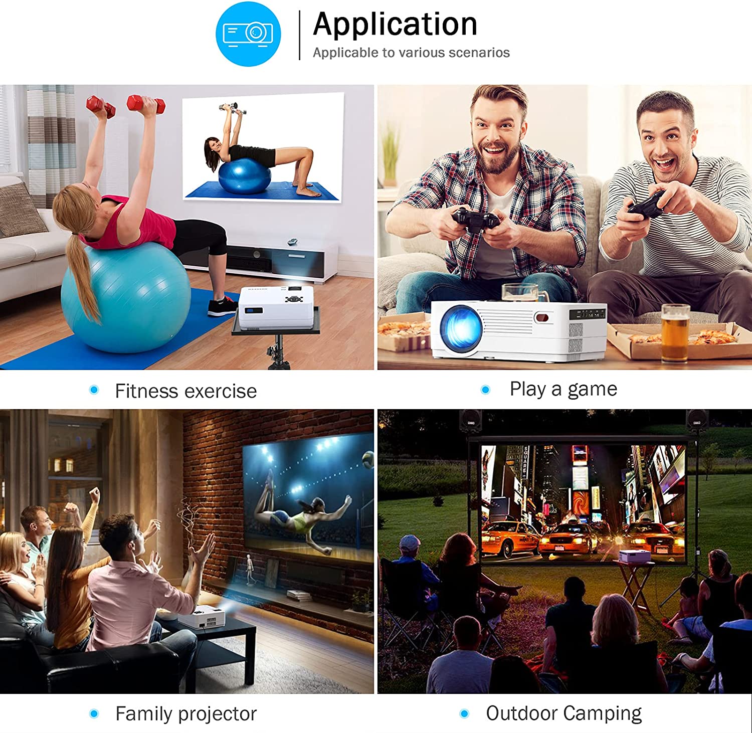 • The projector has a built-in WiFi modual, which can connect to the Internet at high speed.It supports airplay function and screen mirroring functions, and it connects to iOS/ Android system smartphones or tablet easily, and let you enjoy faster and more stable signal transmission via WiFi. Makes your projection movies/ videos/photos/games smoother and enjoyable.