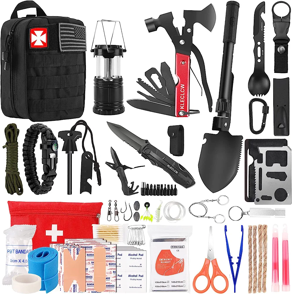 - γPractical Camping Tools and Tactical GearγWe upgraded the survival kit, added several camping accessories, such as 15 in 1 axe, 4 in 1 folding shovel, 10 functions pocket pliers and an tent lantern. In addition, there are multifunctional card, survival bracelet, fire starter, light stick, climbing hook, wire saw, parachute cord, emergency blanket, multi-use spoon, bottle hanging buckle, which can meet your different needs. This practical tool set would be best Christmas gift for man woman.
