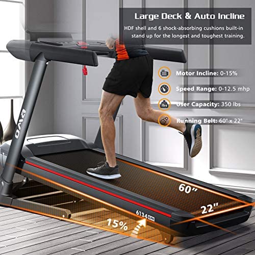 • 【350 LBS Max Weight Capacity】The running deck consists of a large HDF shell, 6 shock-absorbing cushions built-in, and a 60” x 22” running surface to ensure a high weight capacity of 350 LBS. A treadmill for all family members.