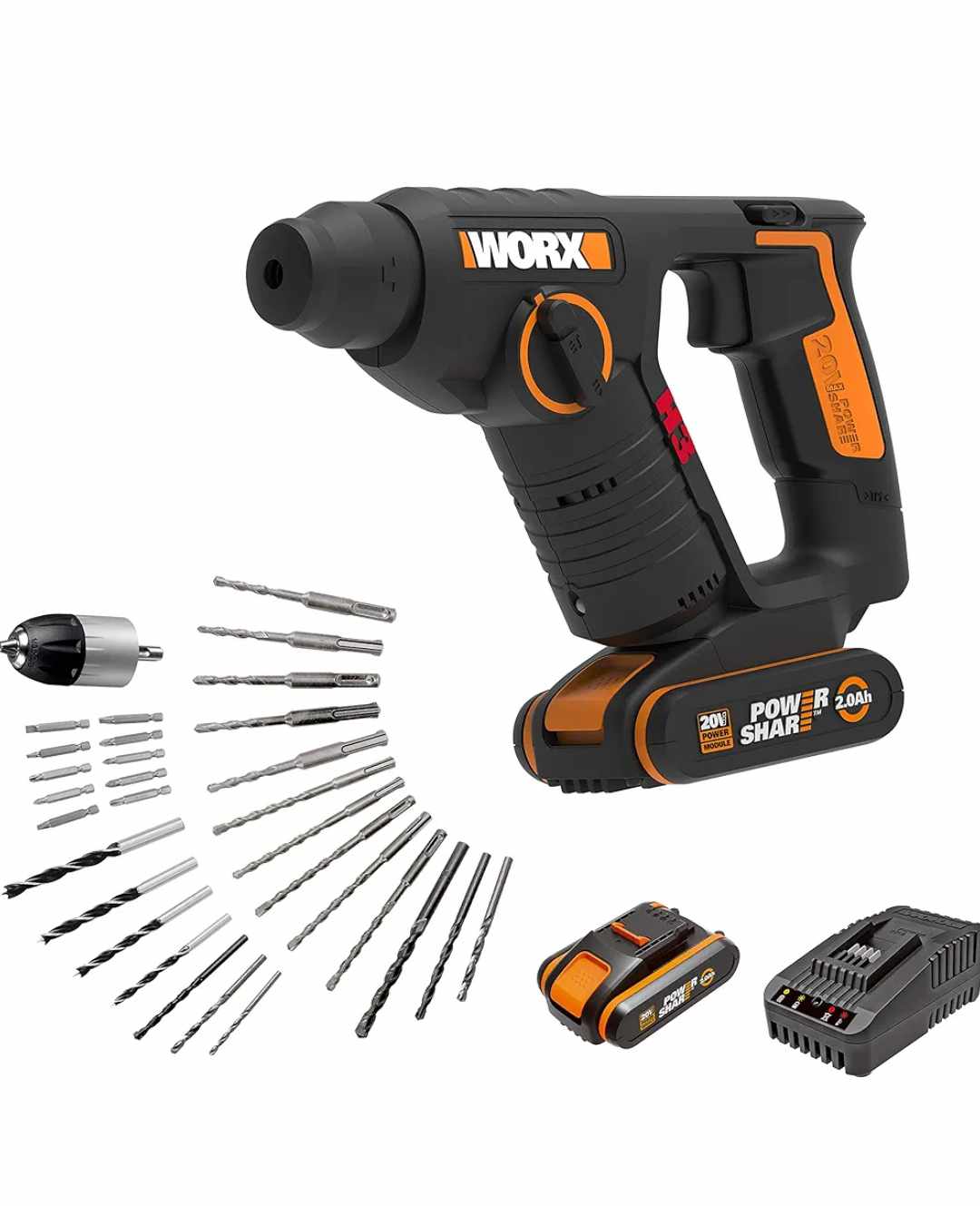 WORX 18 V (MAX20 V) Batteridriven hammare WX394.5, Powershare, SDS-plus borrmaskin med pneumatisk hammarverk för skruvning, borrning och hammare – 1,2 joule slagenergi – 1 timme. Snabbladdare och väska